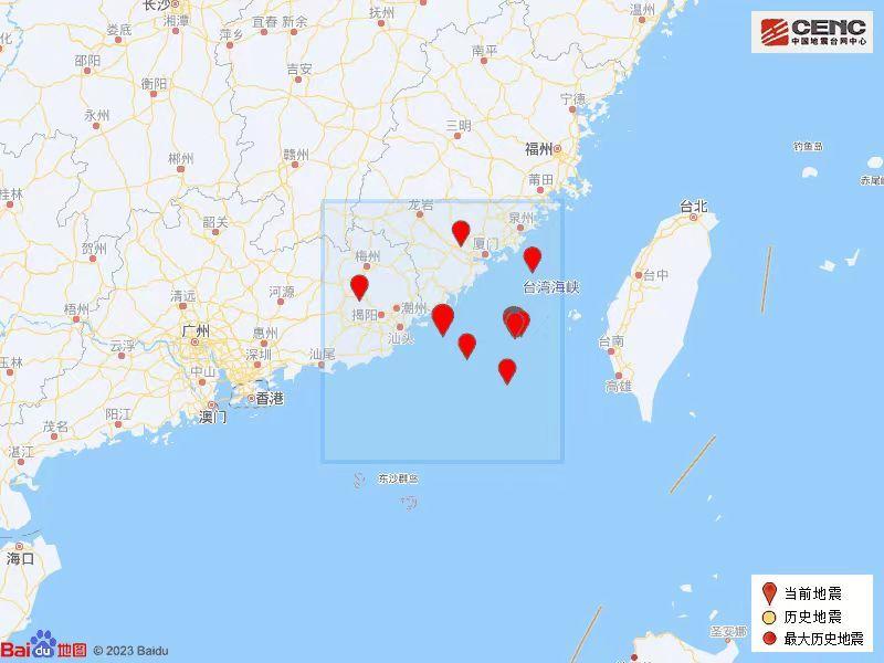 根據(jù)中國(guó)地震臺(tái)網(wǎng)速報(bào)目錄,震中周邊200公里內(nèi)近5年來發(fā)生3級(jí)以上地震共23次,最大地震是2018年11月26日在臺(tái)灣海峽發(fā)生的6.2級(jí)地震(距離本次震中124公里)。