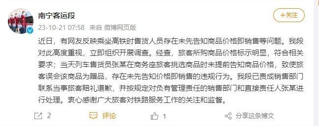針對日前,“女子吐槽高鐵一盒葡萄60元僅200克”。中國鐵路南寧局集團有限公司南寧客運段官方微博回應稱,近日,有網(wǎng)友反映乘坐高鐵時售貨人員存在未先告知商品價格即銷售等問題。我段對此高度重視,立即組織開展調查。經(jīng)查,旅客所購商品價格標示明顯,符合相關要求;當天列車售貨員張某在商務座旅客挑選商品時未提前告知商品價格,致使旅客誤會該商品為贈品,存在未先告知價格即銷售的違規(guī)行為。我段已責成銷售部門聯(lián)系當事旅客賠禮道歉,并按規(guī)定對負有管理責任的銷售部門和直接責任人張某進行處理。衷心感謝廣大旅客對鐵路服務工作的關注和監(jiān)督。