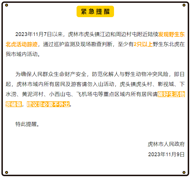 11月9日,黑龍江省虎林市人民政府發(fā)布緊急提醒:2023年11月7日以來(lái),黑龍江省虎林市虎頭鎮(zhèn)江邊和周邊村屯附近陸續(xù)發(fā)現(xiàn)野生東北虎活動(dòng)蹤跡,通過(guò)巡護(hù)監(jiān)測(cè)及現(xiàn)場(chǎng)勘查判斷,至少有2只野生東北虎在虎林市域內(nèi)活動(dòng)。