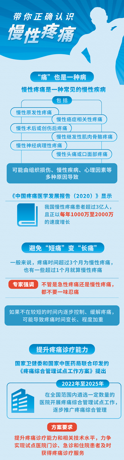 數(shù)據(jù)顯示,我國慢性疼痛患者已超3億人,但知曉率低、就診率低、完全緩解率低,負(fù)“痛”前行降低了患者的生存質(zhì)量。專家表示,加強(qiáng)我國疼痛管理和國民疼痛認(rèn)知教育至關(guān)重要。程 碩制圖(新華社發(fā))