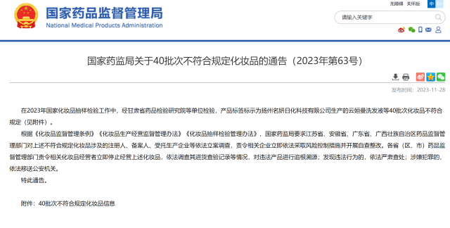 本周,國家藥監(jiān)局官網(wǎng)發(fā)布2023年第63號(hào)化妝品抽檢通告,有40批次不合格化妝品被檢出成分異樣。從通告信息來看,涉事化妝品當(dāng)中洗護(hù)發(fā)產(chǎn)品占比超一半,為26批次,其中20批次來自廣東。