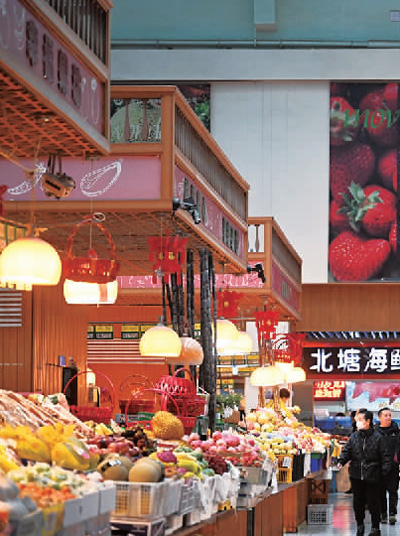 菜市場實現(xiàn)了夜市、大集等多種功能疊加。在北京百姓菜籃子菜市場,不僅能買菜買肉,還能吃到手工餃子、麻辣燙,甚至能買到手機(jī)配件。許多年輕人下班后來這里買點水果再買份晚飯。在青島,有的菜市場在就餐區(qū)配備了舞臺和電子大屏,周末上演樂隊演出,平日里可供消費者玩樂。