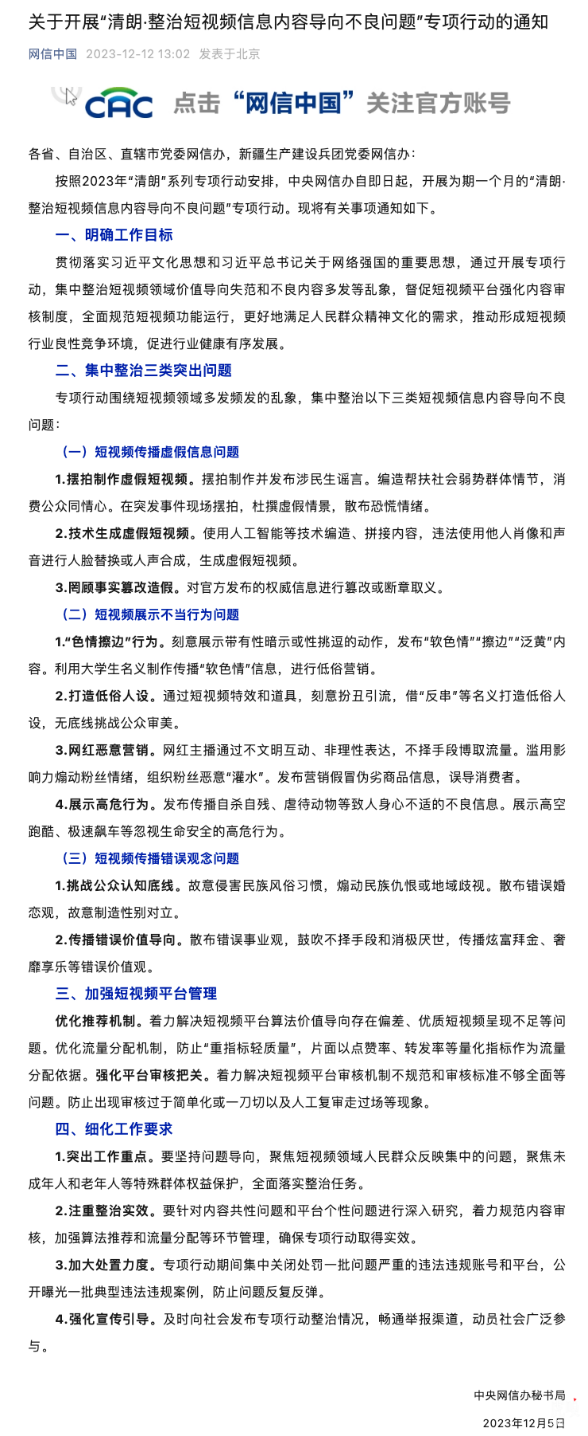 12月12日,據(jù)“網(wǎng)信中國”微信公眾號消息,中央網(wǎng)信辦自即日起,開展為期一個月的“清朗·整治短視頻信息內(nèi)容導(dǎo)向不良問題”專項行動,其中,短視頻傳播虛假信息的問題被列為本次行動重點整治對象。網(wǎng)信辦還表示,將集中打擊杜撰虛假情景、散布恐慌情緒、傳播消極厭世價值觀的視頻亂象。