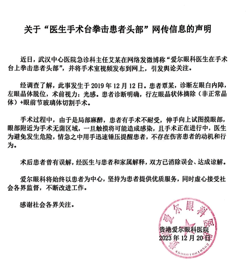 對(duì)此,貴港愛(ài)爾眼科21日凌晨在微信公眾號(hào)發(fā)聲明回應(yīng)稱:經(jīng)調(diào)查了解,此事發(fā)生于2019年12月12日;颊唏,診斷左眼白內(nèi)障,左眼晶體脫位,在行左眼晶狀體摘除(非正常晶體)+眼前節(jié)玻璃體切割手術(shù)過(guò)程中,由于是局部麻醉,患者有手術(shù)不耐受,伸手向上試圖摸眼部,眼部附近為手術(shù)無(wú)菌區(qū)域,一旦觸摸將可能造成感染,且手術(shù)正在進(jìn)行中,醫(yī)生為避免發(fā)生危險(xiǎn),情急之中用手迅速錘壓提醒患者,不存在傷害患者的動(dòng)機(jī)和行為。
