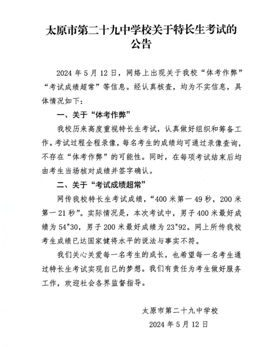 5月12日,網絡上出現(xiàn)關于山西省太原市第二十九中學!绑w考作弊”“考試成績超!钡刃畔,引發(fā)社會廣泛關注。當天深夜,太原市第二十九中學校就該事件發(fā)布公告稱,經認真核查,上述信息均為不實信息。