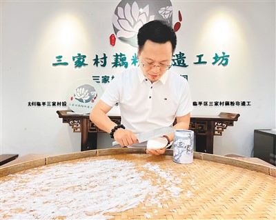 吳景順在三家村藕粉非遺工坊體驗(yàn)手削藕粉傳統(tǒng)技藝。