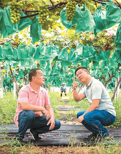陳李波(右)在崇賢村葡萄種植園與農(nóng)戶一起察看葡萄長(zhǎng)勢(shì)。