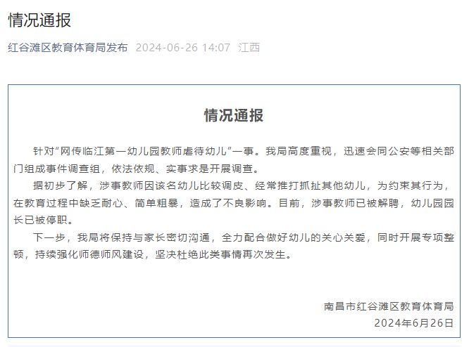 6月26日,針對“網(wǎng)傳臨江第一幼兒園教師虐待幼兒”一事,南昌市紅谷灘區(qū)教育體育局發(fā)布情況通報稱,事發(fā)后紅谷灘區(qū)教育體育局高度重視,迅速會同公安等相關部門組成事件調(diào)查組,依法依規(guī)、實事求是開展調(diào)查。