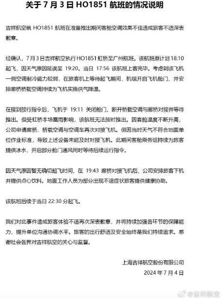 7月4日,上海吉祥航空股份有限公司發(fā)布關(guān)于7月3日HO1851航班的情況說明:吉祥航空就HO1851航班在準備推出期間客艙空調(diào)效果不佳造成旅客不適深表收意。