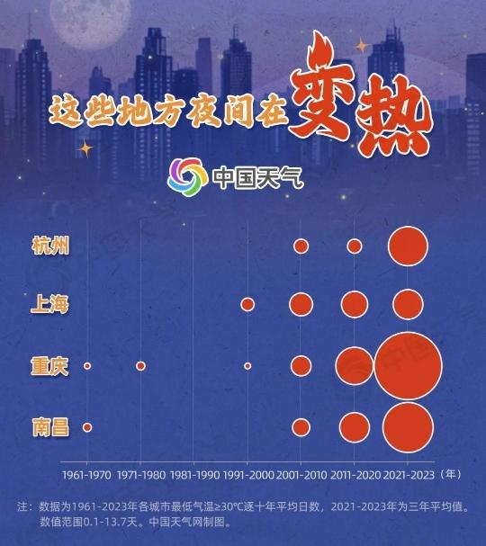 中國(guó)天氣網(wǎng)盤點(diǎn)氣象大數(shù)據(jù)發(fā)現(xiàn),不少地方夜間正在明顯變熱。1961年以來(lái),南昌、重慶、上海、杭州等地最低氣溫達(dá)到30℃或以上的天數(shù)正在明顯變多。2000年之前,上述城市最低氣溫達(dá)到30℃的情況只是零星出現(xiàn),但2001年以后這一數(shù)據(jù)增長(zhǎng)非常明顯,近三年達(dá)到頂峰。