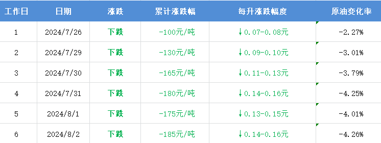 國內(nèi)油價(jià)將在8月8日24時(shí)(本周四晚12點(diǎn))進(jìn)行下半年第3次調(diào)整。本輪國內(nèi)油價(jià)計(jì)價(jià)統(tǒng)計(jì)周期第6個(gè)工作日,參考原油變化率-4.26%,預(yù)計(jì)汽柴油下調(diào)185元/噸,折算為每升油價(jià)下跌0.14-0.16元。