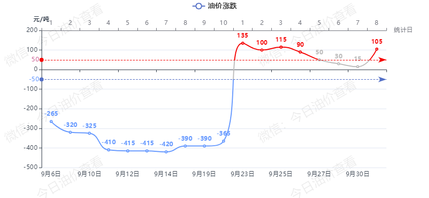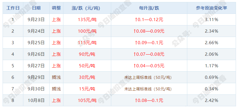 7日晚國(guó)際油價(jià)繼續(xù)大漲,布倫特原油和美油雙雙大漲近4個(gè)百分點(diǎn),連續(xù)5天大漲,完全漲瘋了。從9月23日周期統(tǒng)計(jì)開(kāi)始至今,原油變化率經(jīng)歷了多次波動(dòng)。最初,第1個(gè)工作日時(shí),參考原油變化率為3.11%,預(yù)計(jì)汽柴油上調(diào)135元/噸,折算后每升油價(jià)上漲約0.1—0.12元。隨后幾日,變化率有所回調(diào),但整體仍保持在上調(diào)預(yù)期內(nèi)。特別是在國(guó)慶假期期間,受?chē)?guó)際油價(jià)大幅上漲的影響,油價(jià)上調(diào)預(yù)期再度增強(qiáng)。