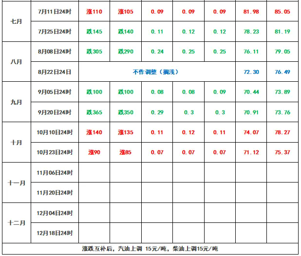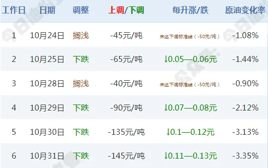 油價最新調(diào)整消息:本輪油價調(diào)整時間為2024年11月06日24時。截至10月31日,第6個工作日,汽、柴油價格下跌145元/噸,折合中石油、中石化、殼牌加油站汽油、柴油價格下跌0.11—0.13元/升。