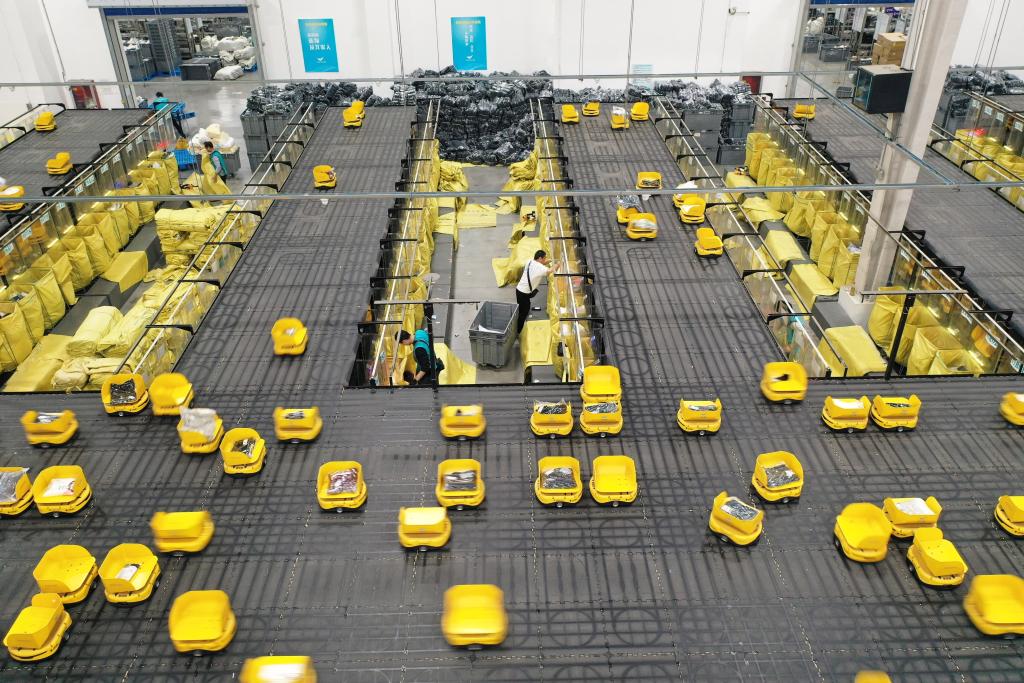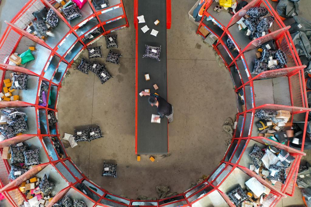 11月6日,工作人員在山東省寧陽縣菜鳥智慧物流園內(nèi)分揀快遞商品(無人機(jī)照片)。新華社記者 朱崢 攝