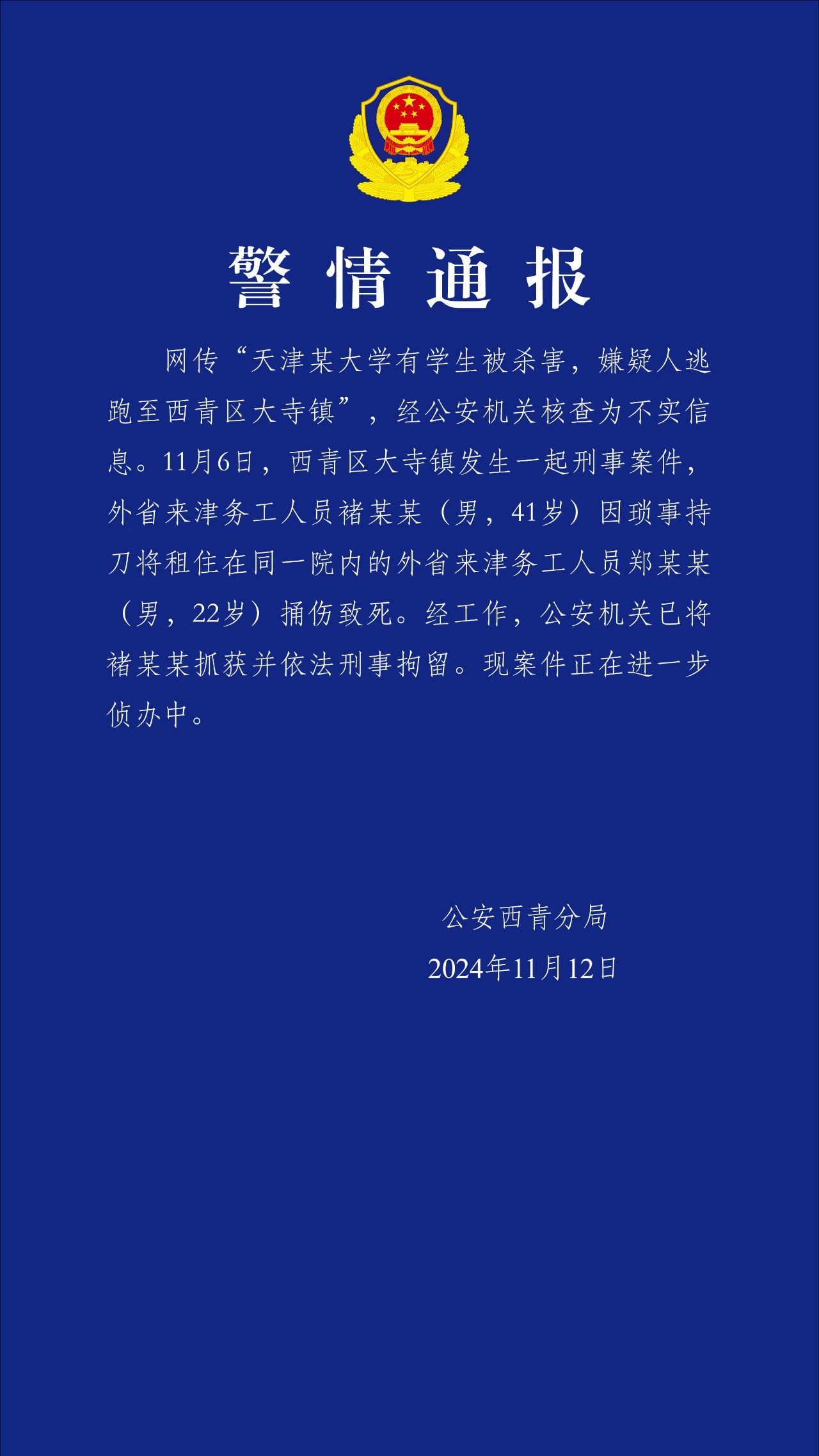 日前,網(wǎng)傳天津某大學有學生被殺害,嫌疑人逃跑至西青區(qū)大寺鎮(zhèn),引發(fā)熱議。11月12日凌晨,天津市公安局西青分局就此發(fā)布警情通報稱,經(jīng)公安機關(guān)核查為不實信息。