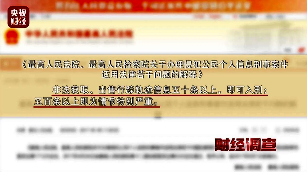 2017年《最高人民法院、最高人民檢察院關(guān)于辦理侵犯公民個人信息刑事案件適用法律若干問題的解釋》中規(guī)定:非法獲取、出售行蹤軌跡信息五十條以上,即可入刑;五百條以上即為情節(jié)特別嚴(yán)重。