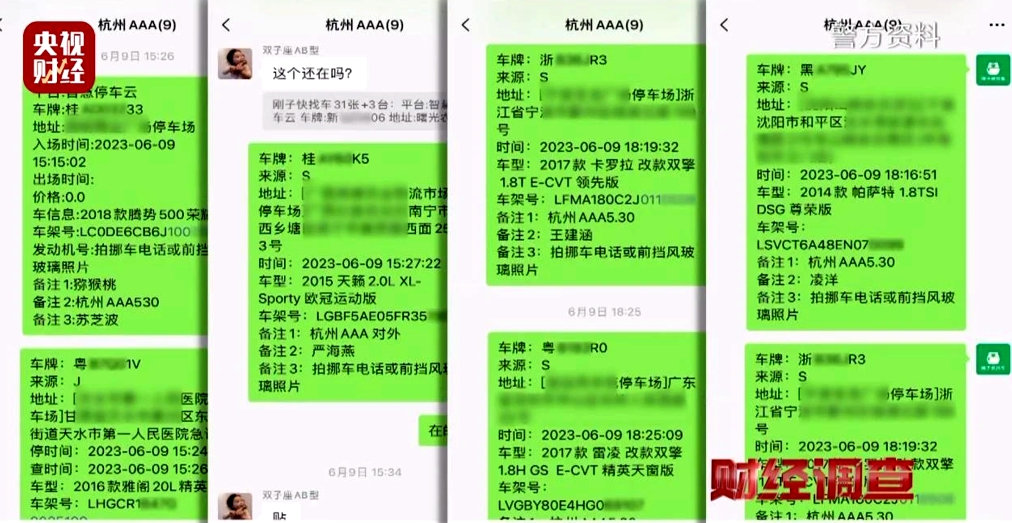 犯罪分子的聊天群里每天在滾動發(fā)布著各種車輛的實(shí)時(shí)停車信息,包括了車牌號、停車場具體地址、進(jìn)場時(shí)間等等。