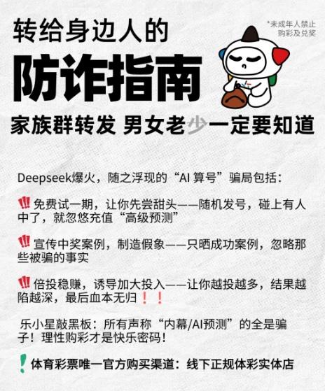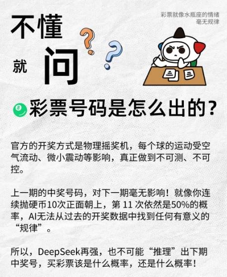 “中國體育彩票訂閱號”微信公眾號12日發(fā)文稱,再強(qiáng)大的AI也無法預(yù)測中獎號碼。