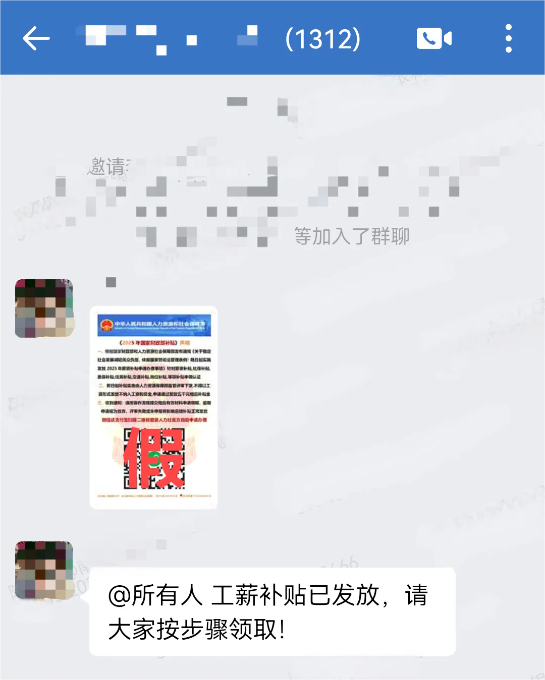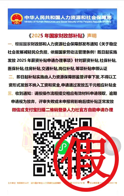 近日,小雪的企業(yè)微信賬號(hào)被騙子盜用,同事大強(qiáng)被“小雪”拉入名為“工薪補(bǔ)貼”的企業(yè)微信群聊,隨后“小雪”在群內(nèi)發(fā)布了一張圖片,圖片上有“中華人民共和國(guó)人力資源和社會(huì)保障部”“《2025年國(guó)家財(cái)政部補(bǔ)貼》聲明“微信或支付寶掃描二維碼登錄人力社官方自助申請(qǐng)辦理”等字樣