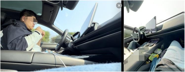 司機(jī)在剪指甲(左),司機(jī)雙手脫離方向盤(右)。受訪者供圖