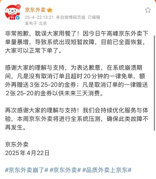 “為表達歉意,在系統(tǒng)崩潰期間,凡是沒有取消訂單且超時20分鐘的一律免單,額外再贈送3張25-20的金券;凡是取消訂單的一律贈送2張25-20的金券以供未來三天消費。”京東外賣稱,會持續(xù)優(yōu)化服務(wù)與體驗,本周京東外賣將進行全系統(tǒng)壓測,確保此類故障不再發(fā)生。