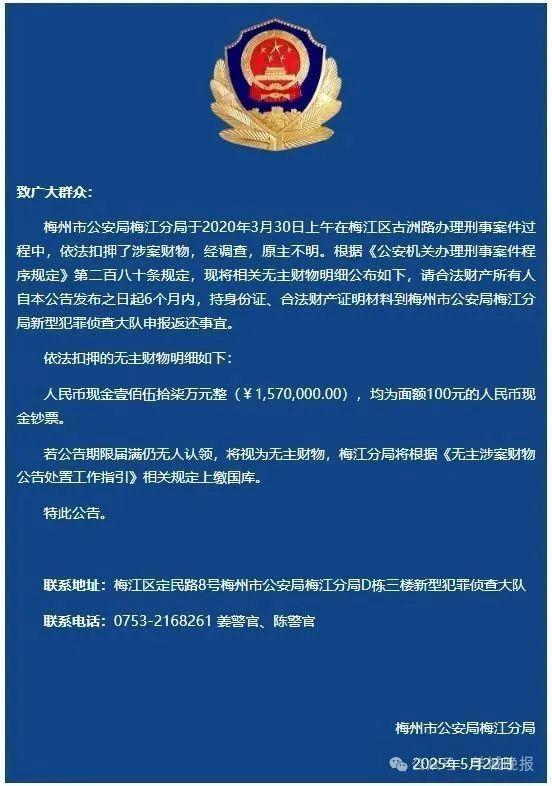 若公告期限屆滿仍無(wú)人認(rèn)領(lǐng),將視為無(wú)主財(cái)物,梅江分局將根據(jù)《無(wú)主涉案財(cái)物公告處置工作指引》相關(guān)規(guī)定上繳國(guó)庫(kù)。