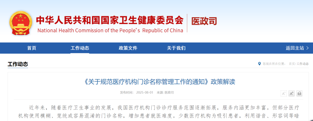 針對部分醫(yī)療機構(gòu)使用模糊、籠統(tǒng)或容易混淆的門診名稱,少數(shù)醫(yī)療機構(gòu)為吸引患者,利用諧音、形容詞等暗示療效的門診名稱誤導患者等情況,國家衛(wèi)生健康委近日發(fā)布了《關(guān)于規(guī)范醫(yī)療機構(gòu)門診名稱管理工作的通知》,強調(diào)醫(yī)療機構(gòu)要遵循依法合規(guī)、科學規(guī)范、清晰準確的原則進行門診命名。