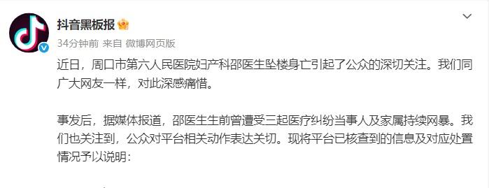 近日,周口市第六人民醫(yī)院婦產(chǎn)科邵醫(yī)生墜樓身亡引起了公眾的深切關(guān)注。8日,抖音黑板報微博發(fā)文回應(yīng)相關(guān)賬號處置情況: