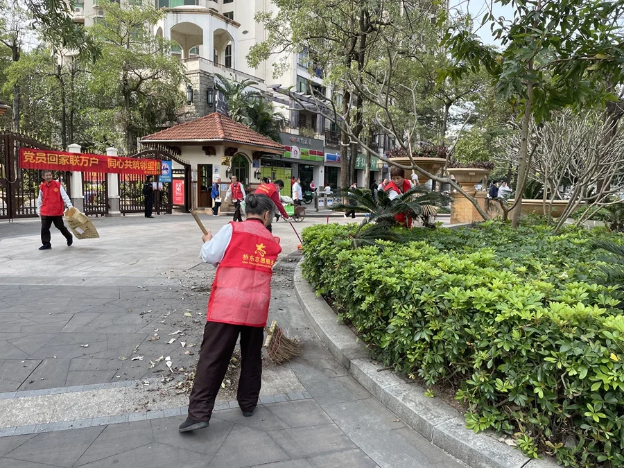 惠州“黨支部+居民自治+行業(yè)引領(lǐng)”模式破解小區(qū)物業(yè)治理難題。圖為星河丹堤志愿服務(wù)隊(duì)在小區(qū)清理衛(wèi)生。
