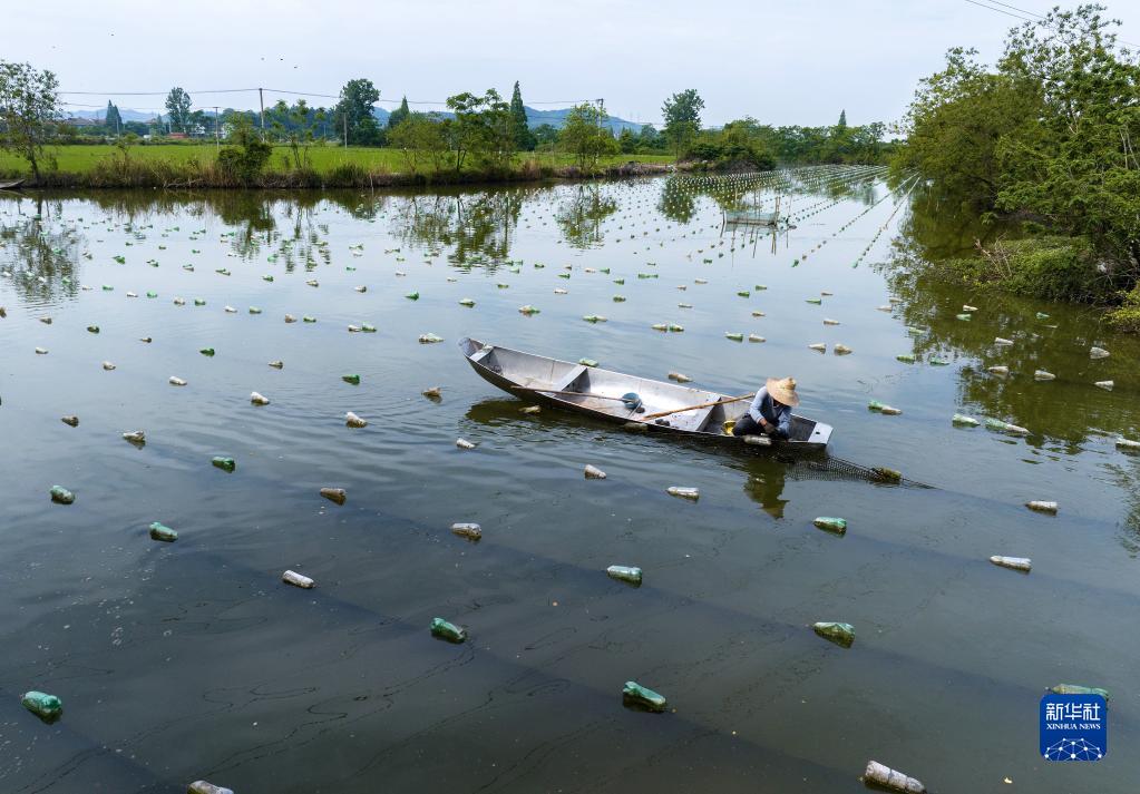 在浙江省諸暨市山下湖鎮(zhèn)一處珍珠生產(chǎn)基地,珠農(nóng)查看珍珠生長情況(5月16日攝,無人機(jī)照片)。