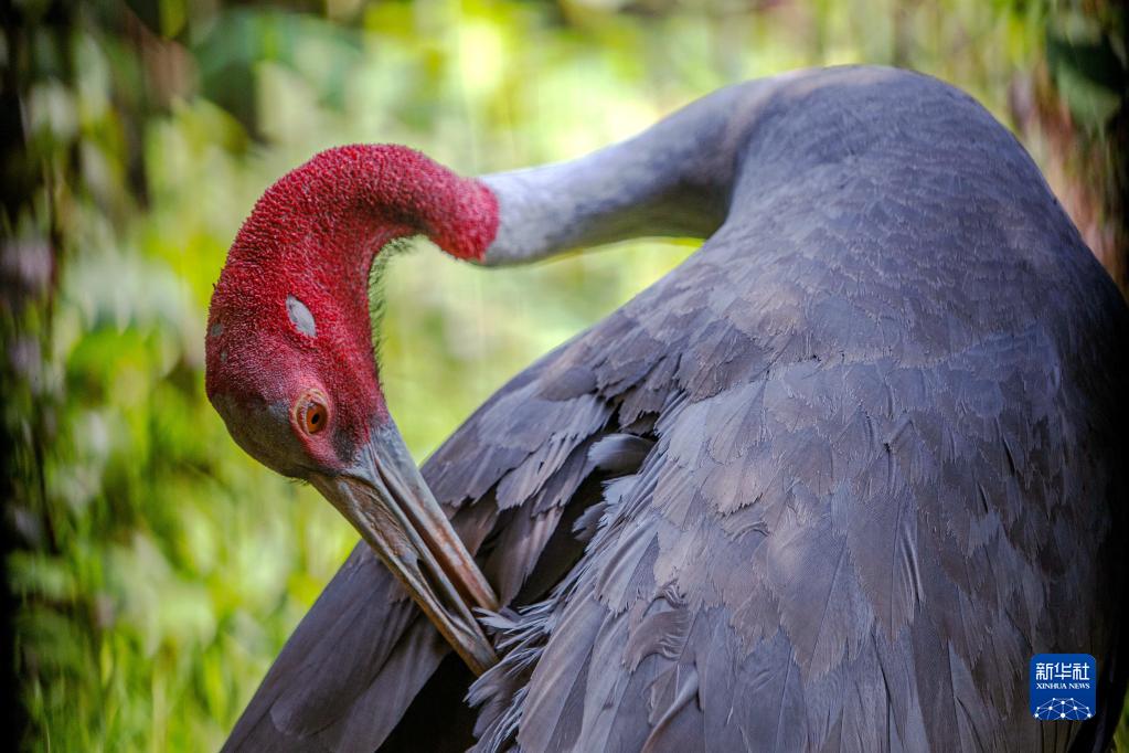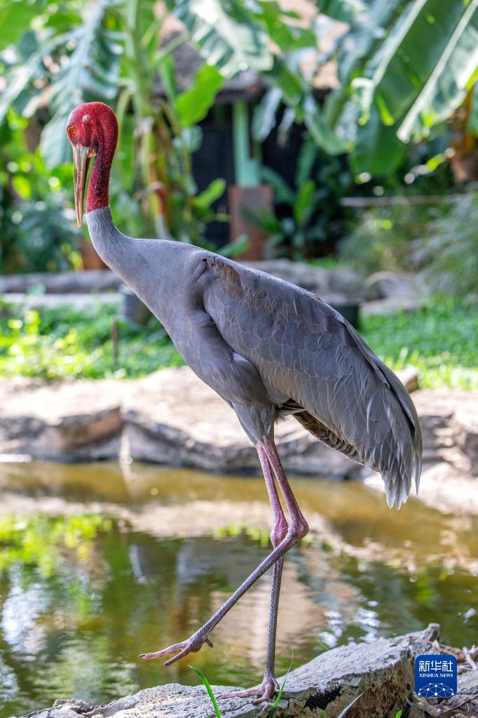 這是5月16日在泰國(guó)呵叻府動(dòng)物園赤頸鶴保育中心拍攝的赤頸鶴。