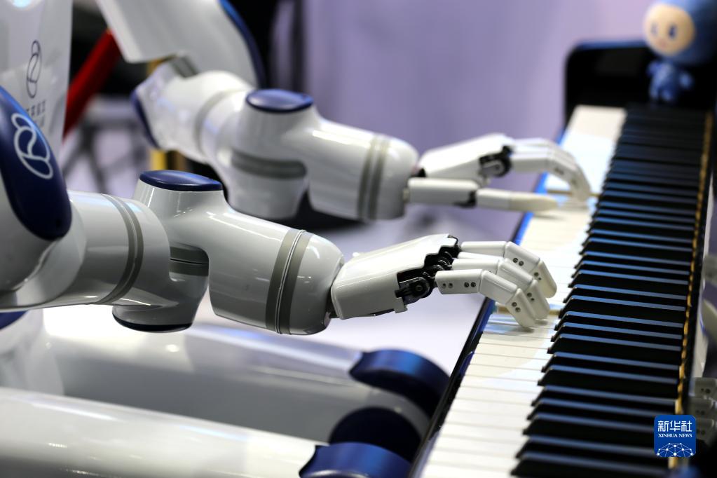5月24日,機器人在峰會現(xiàn)場彈奏鋼琴。