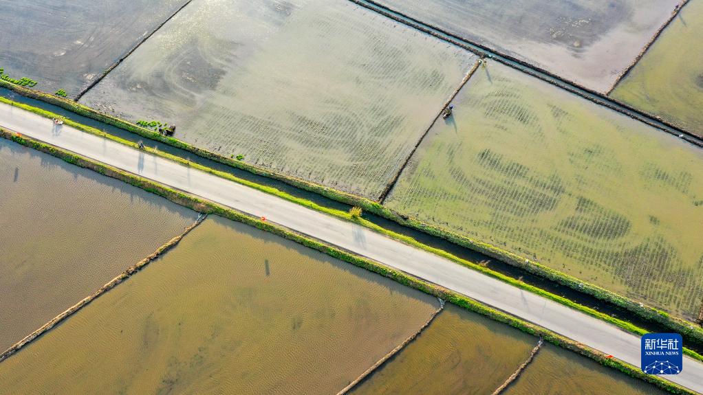 5月24日,農民在吉林省長春市九臺區(qū)龍嘉街道紅光村操作農機進行水稻插秧(無人機照片)。