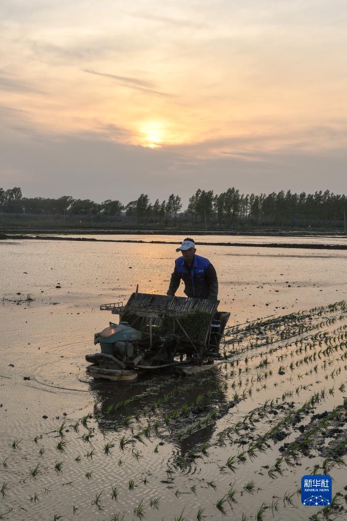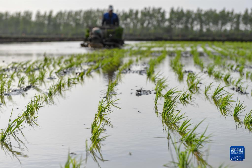 5月24日,農民在吉林省長春市九臺區(qū)龍嘉街道紅光村操作農機進行水稻插秧。