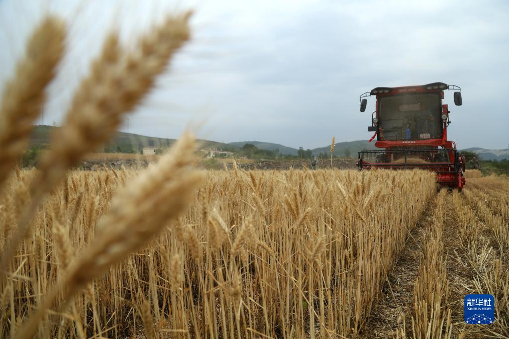 5月24日,收割機在山東省棗莊市山亭區(qū)鳧城鎮(zhèn)文王峪村田間收割小麥。