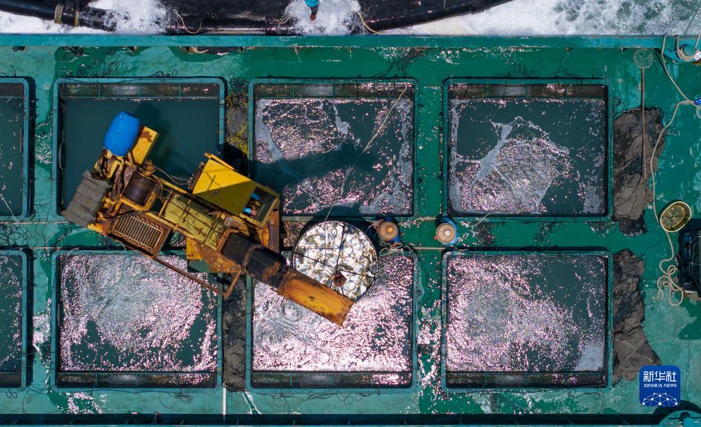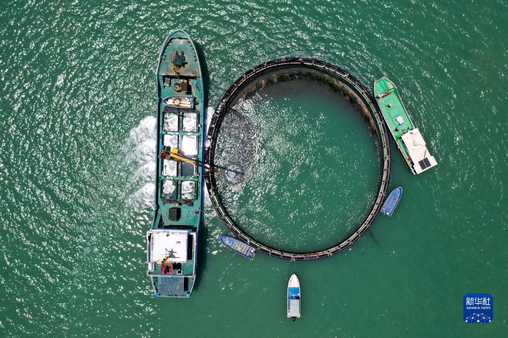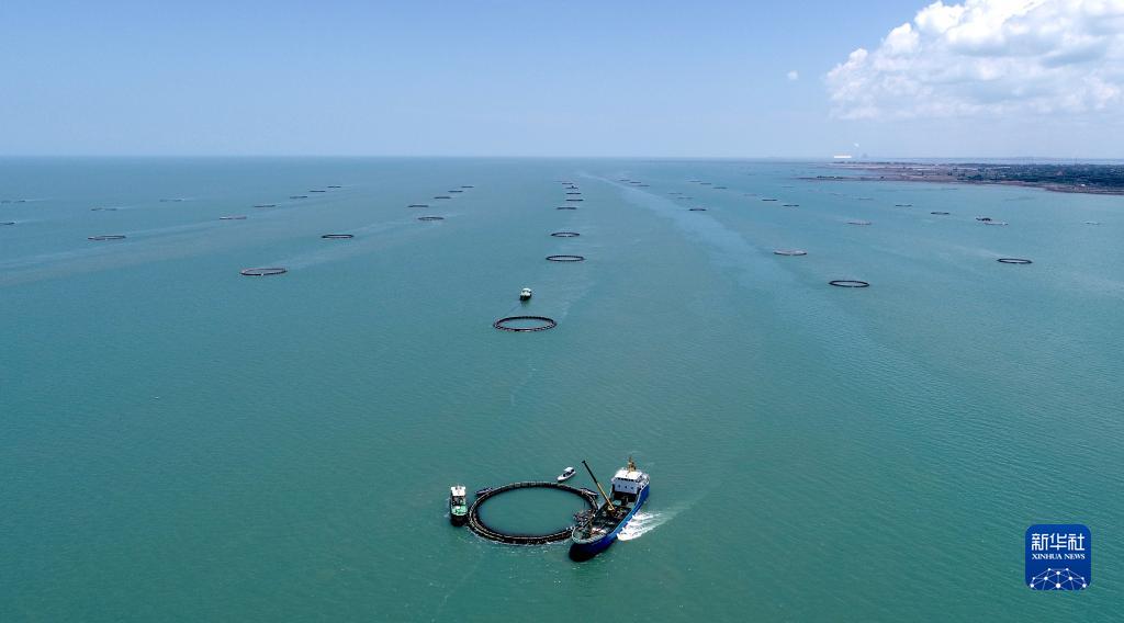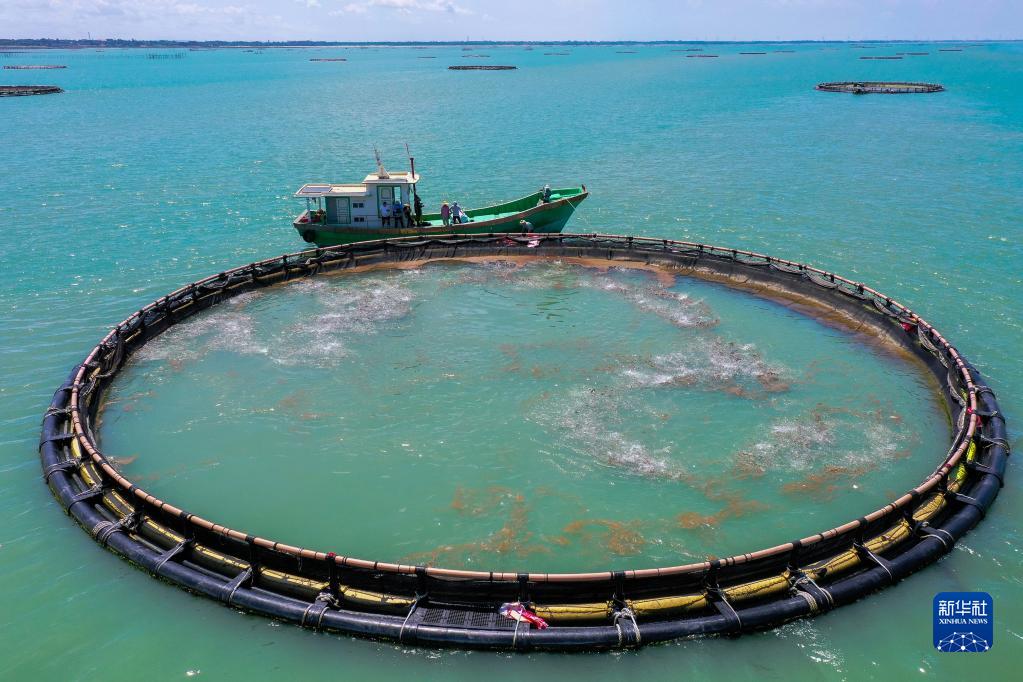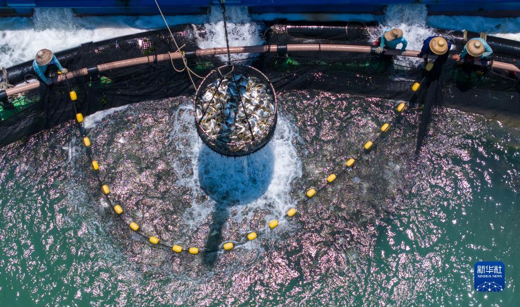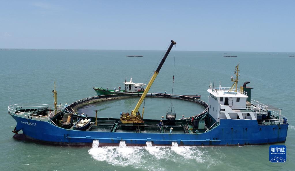 5月27日,在湛江市徐聞縣西連鎮(zhèn),漁業(yè)工人從徐聞國橋深海養(yǎng)殖有限公司的金鯧魚深海網(wǎng)箱捕魚(無人機(jī)照片)。
