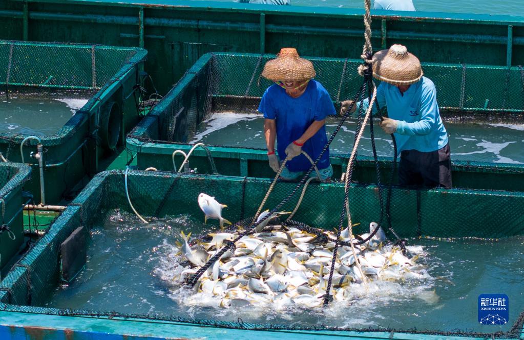 5月27日,在湛江市徐聞縣西連鎮(zhèn),漁業(yè)工人在深海網(wǎng)箱拉網(wǎng)收獲金鯧魚。