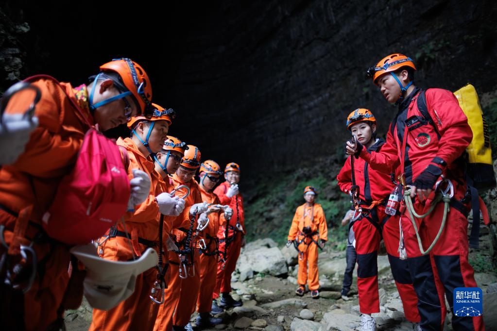 游客在貴州省綏陽縣地下裂縫景區(qū)體驗(yàn)洞穴探險前接受教練的培訓(xùn)指導(dǎo)(5月17日攝)。