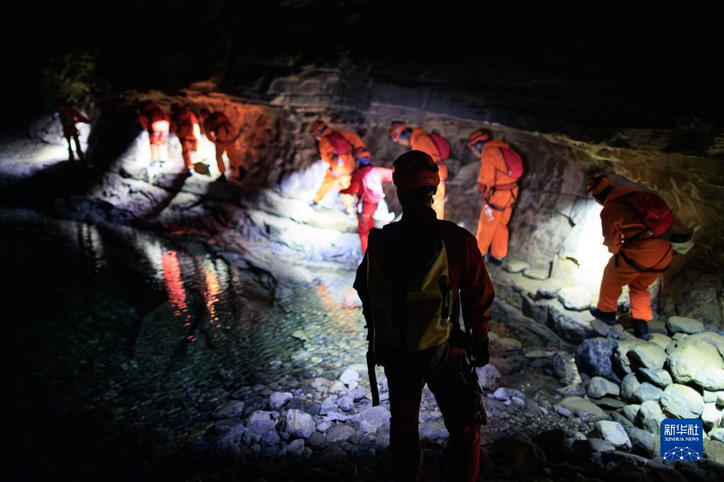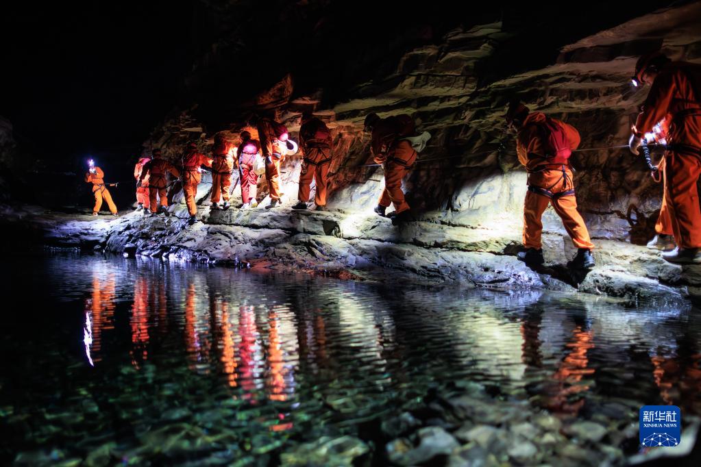 游客在貴州省綏陽縣地下裂縫景區(qū)體驗(yàn)洞穴探險(5月17日攝)。