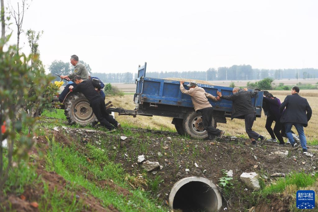 5月30日,在河南省駐馬店市正陽(yáng)縣銅鐘鎮(zhèn),村民在幫忙推車(chē),車(chē)?yán)镅b著剛收獲的小麥。