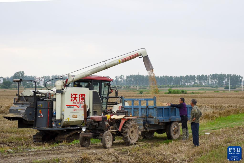 5月30日,在河南省駐馬店市正陽(yáng)縣銅鐘鎮(zhèn),收割機(jī)將收獲的小麥裝車(chē)。
