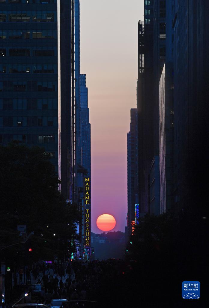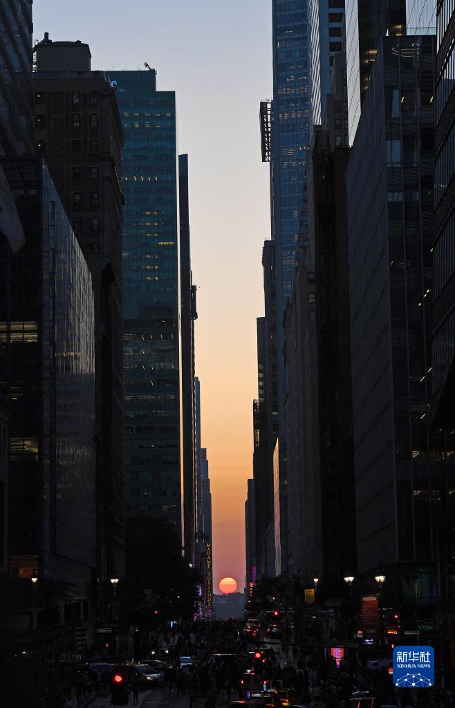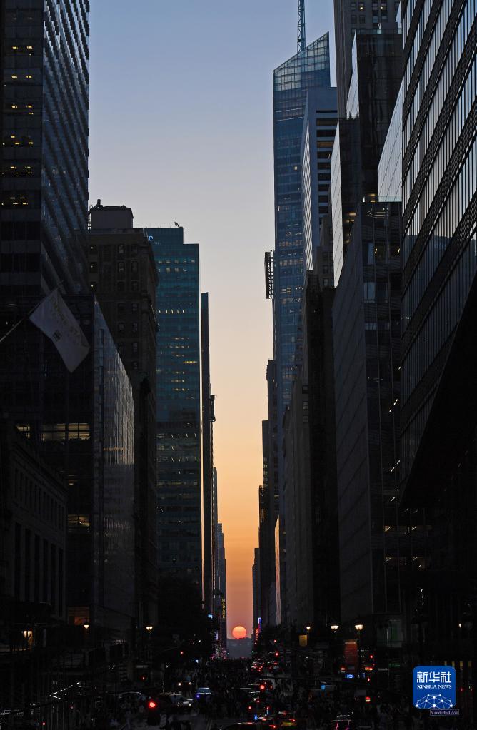 當(dāng)日,紐約出現(xiàn)“曼哈頓懸日”景觀。“曼哈頓懸日”是紐約市標(biāo)志性景觀,每年5月和7月出現(xiàn)兩次,指日落時太陽正好出現(xiàn)在曼哈頓東西向街道正上方、似乎懸在兩側(cè)高樓大廈之間的戲劇性畫面。