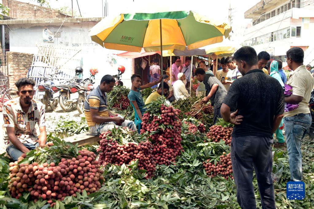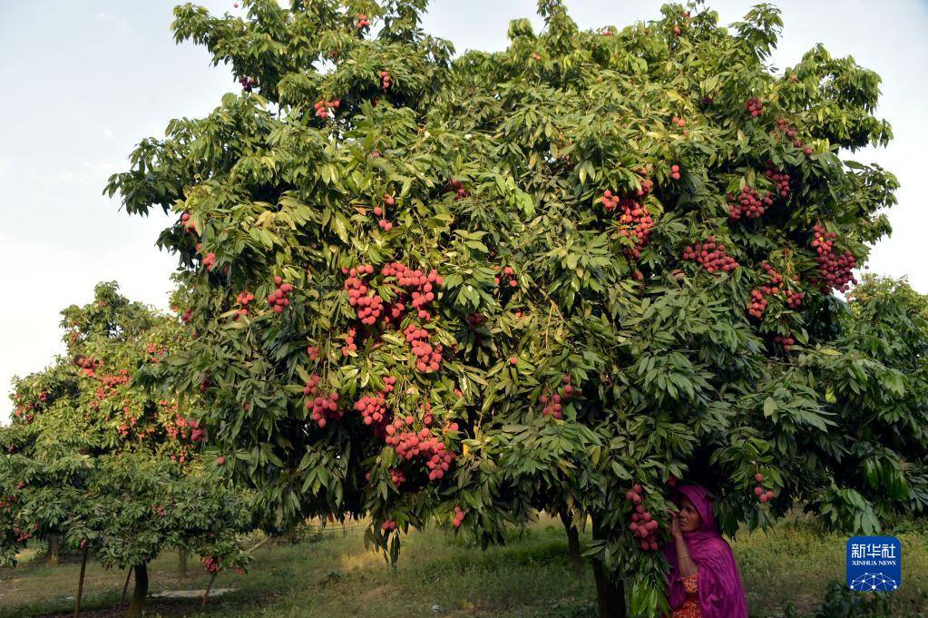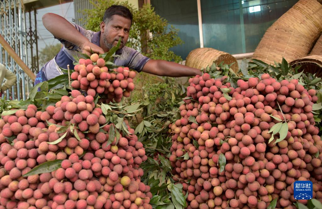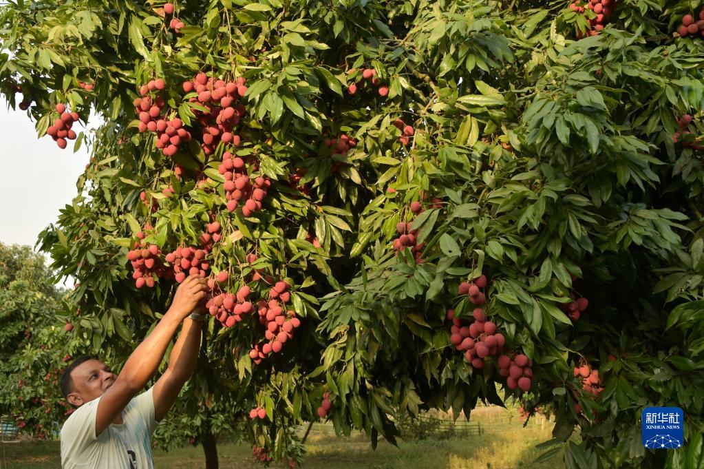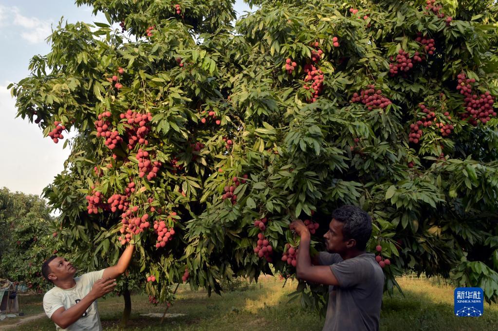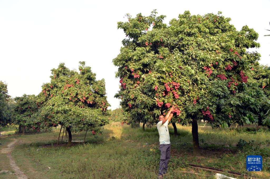 6月4日,農(nóng)民在孟加拉國(guó)迪納杰布爾的果園里采摘荔枝。