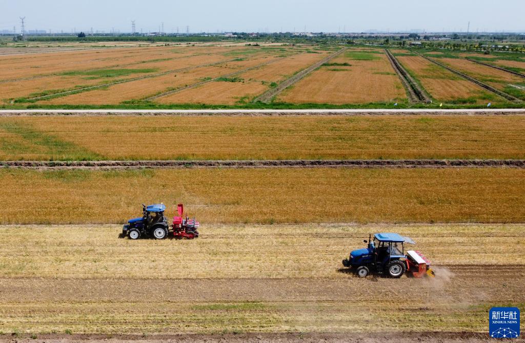 6月11日,在天津市靜海區(qū)蔡公莊鎮(zhèn),農(nóng)機(jī)在收割完小麥的土地上進(jìn)行玉米播種(無人機(jī)照片)。