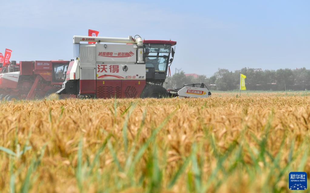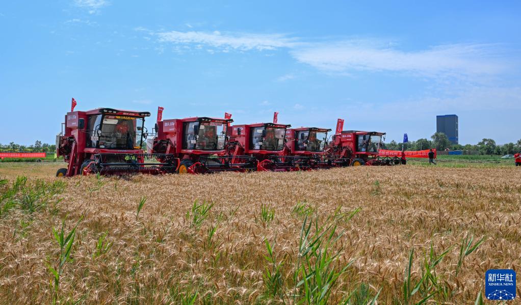 6月11日,在天津市靜海區(qū)蔡公莊鎮(zhèn),多臺農(nóng)機(jī)進(jìn)行小麥機(jī)收減損比賽。