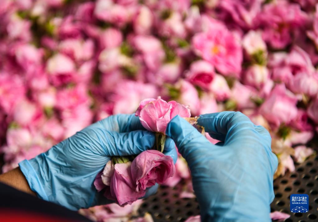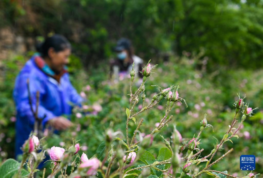 6月14日,在四川省阿壩州小金縣新橋鄉(xiāng)共和村,當(dāng)?shù)胤N植戶在采摘玫瑰鮮花。