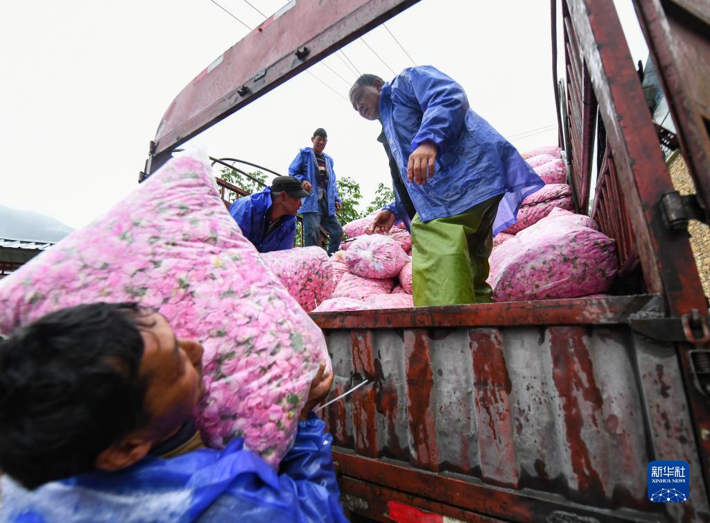 6月14日,在四川省阿壩州小金縣新橋鄉(xiāng)共和村,“金山玫瑰”基地的工作人員在收購當(dāng)?shù)胤N植戶的玫瑰鮮花。
