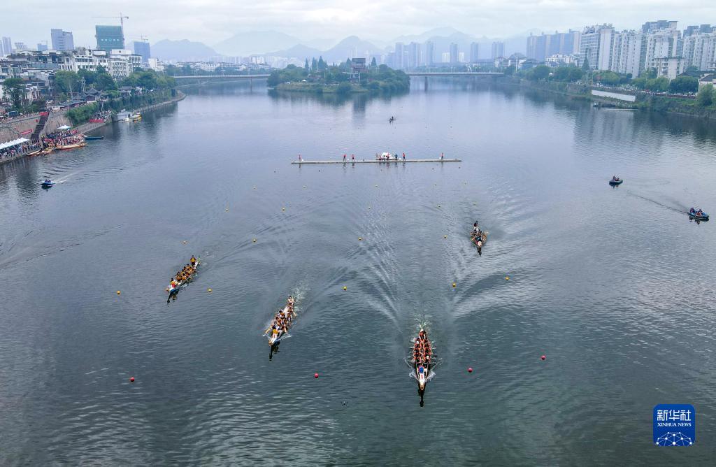 6月18日,龍舟隊(duì)在安徽省黃山市屯溪區(qū)新安江水域上展開角逐(無人機(jī)照片)。