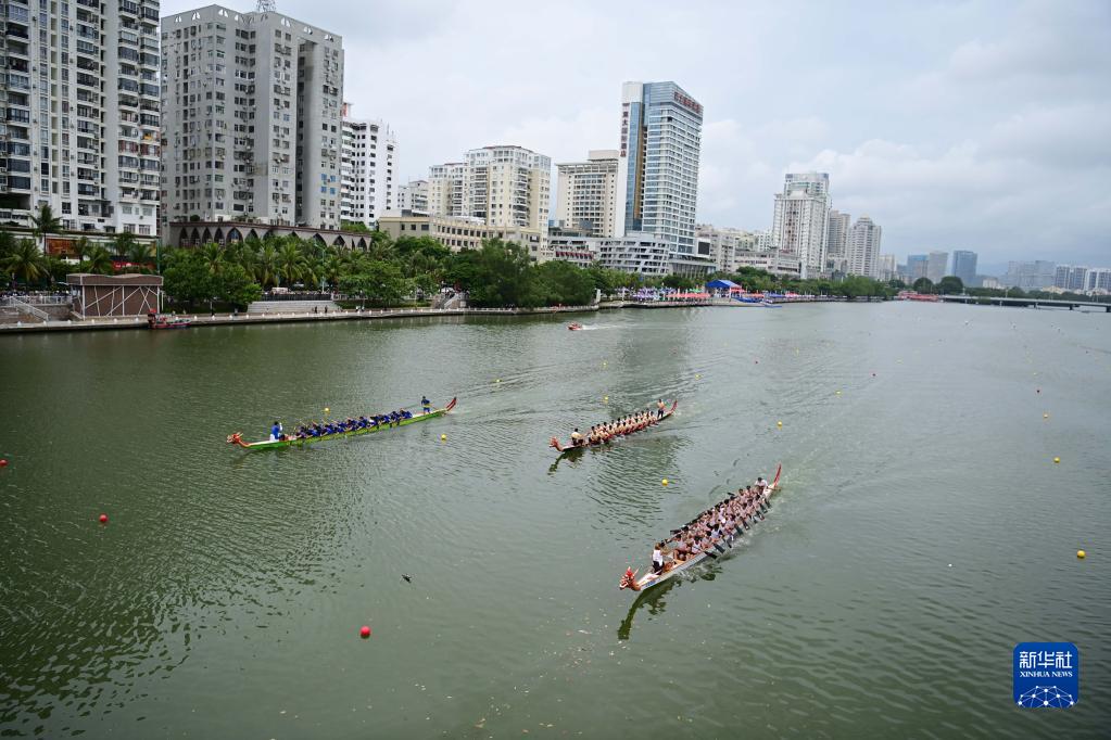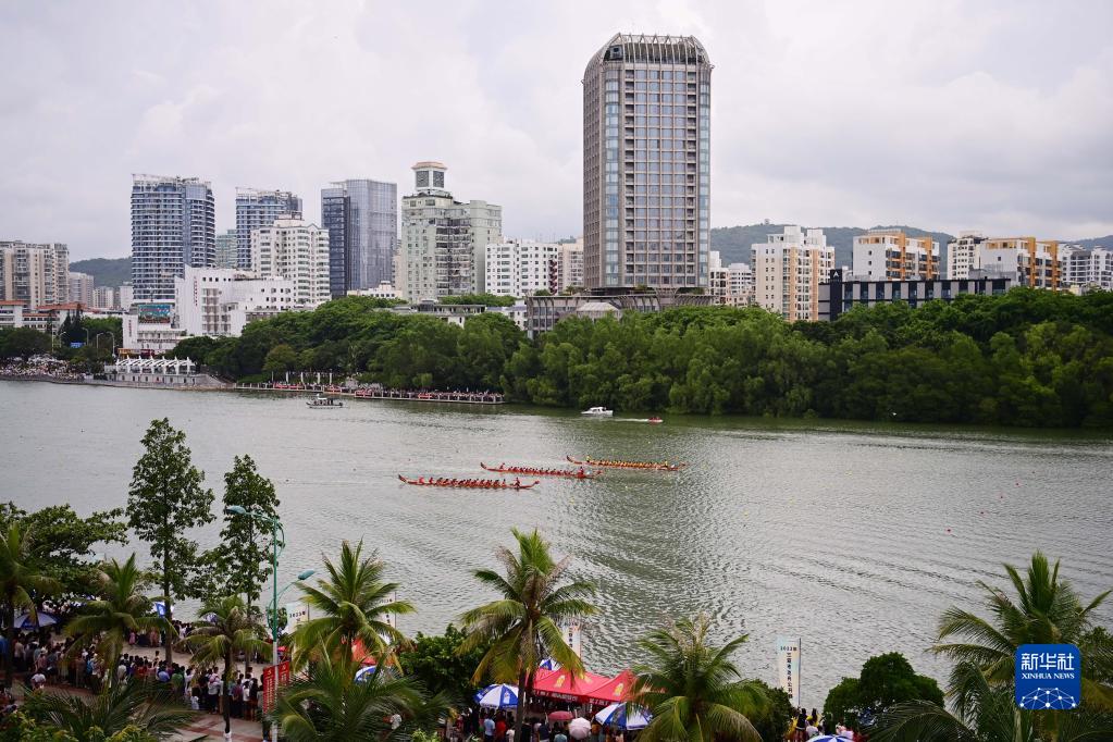 6月18日,龍舟隊(duì)在海南省三亞市三亞河上進(jìn)行比賽。