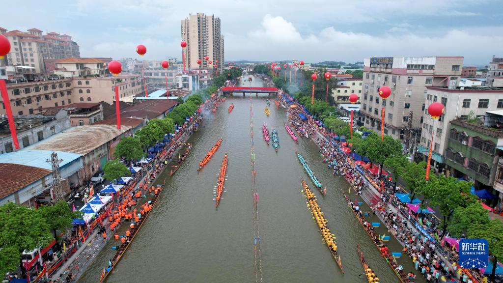 6月18日,龍舟隊(duì)在廣東省肇慶市高要區(qū)金利鎮(zhèn)西圍涌參賽(無人機(jī)照片)。